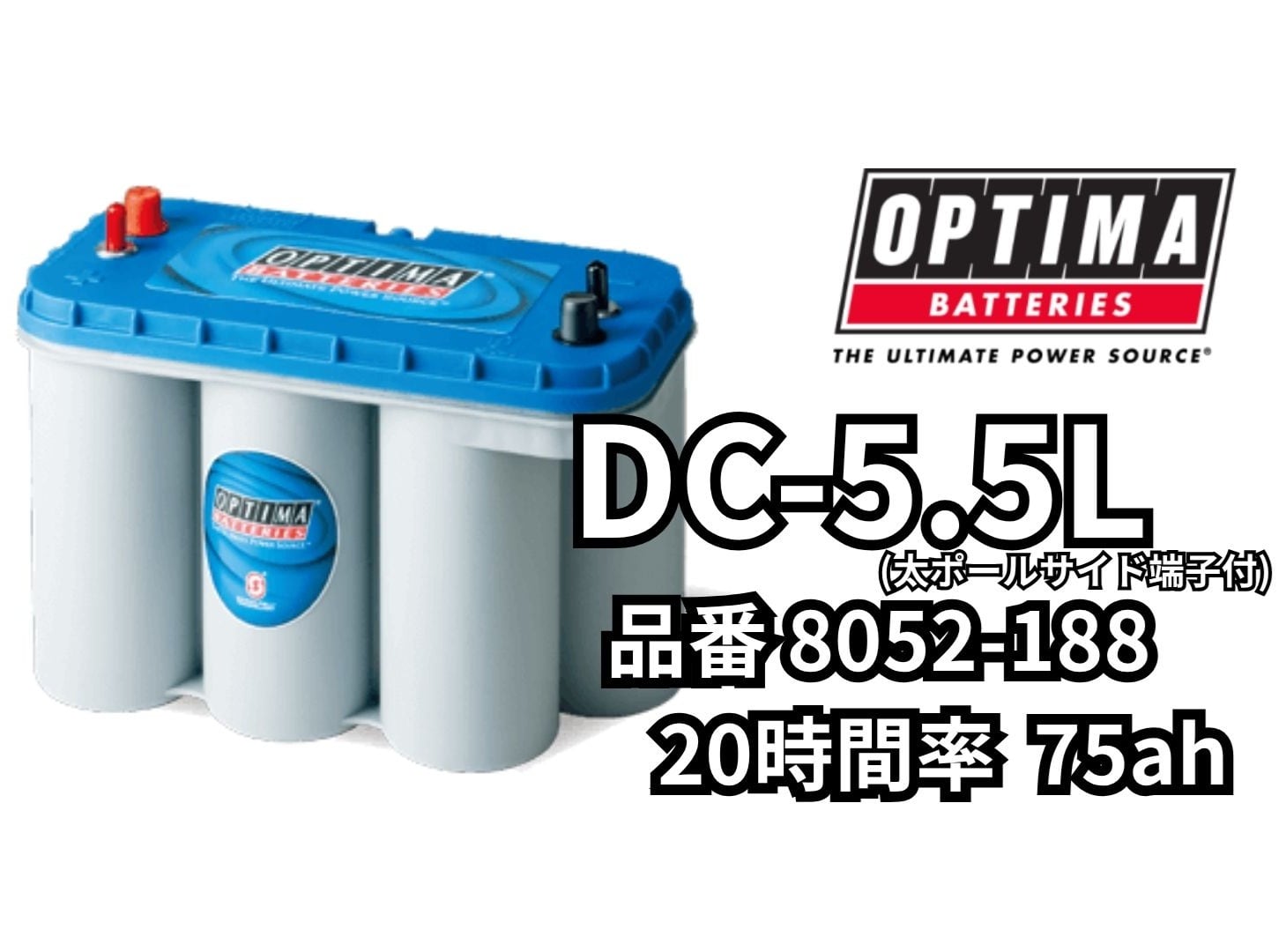 【個人宅配送不可、法人様のみ配送可】OPTIMA オプティマ バッテリー DC-5.5L 太ポールサイド端子付 66Ah ブルートップ 8052-188 正規品 合格証シール付